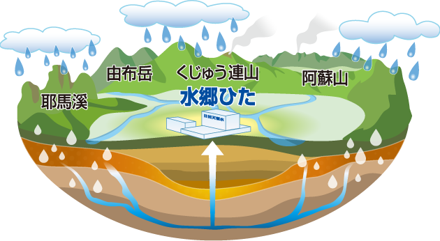 大分県日田市は北部九州のほぼ中央、阿蘇や久住など千メートル級の九州の屋根に囲まれた盆地にあります。この豊かな森に囲まれた大自然によって、天然のミネラルウォーター「日田天領水」は育まれています。